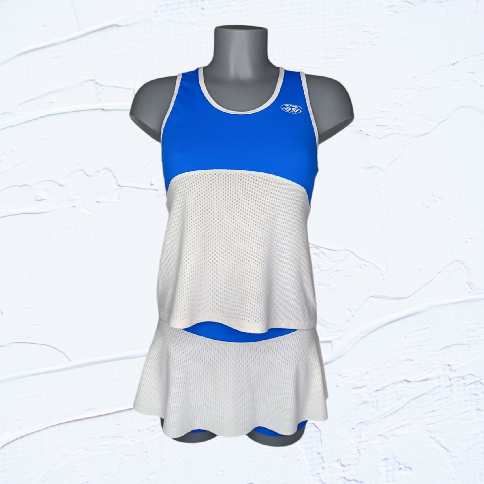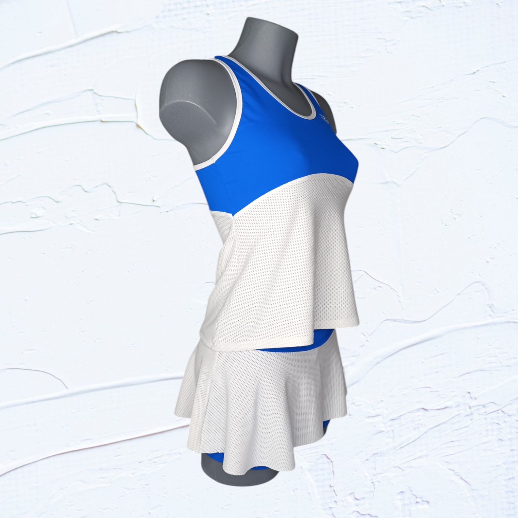 Descubre el conjunto de pádel Oriana, donde la funcionalidad deportiva se encuentra con el diseño fresco y femenino. Compuesto por una camiseta de tirantes en azul intenso con detalles en blanco y una falda a juego, este conjunto destaca por su comodidad, transpirabilidad y estilo dinámico.