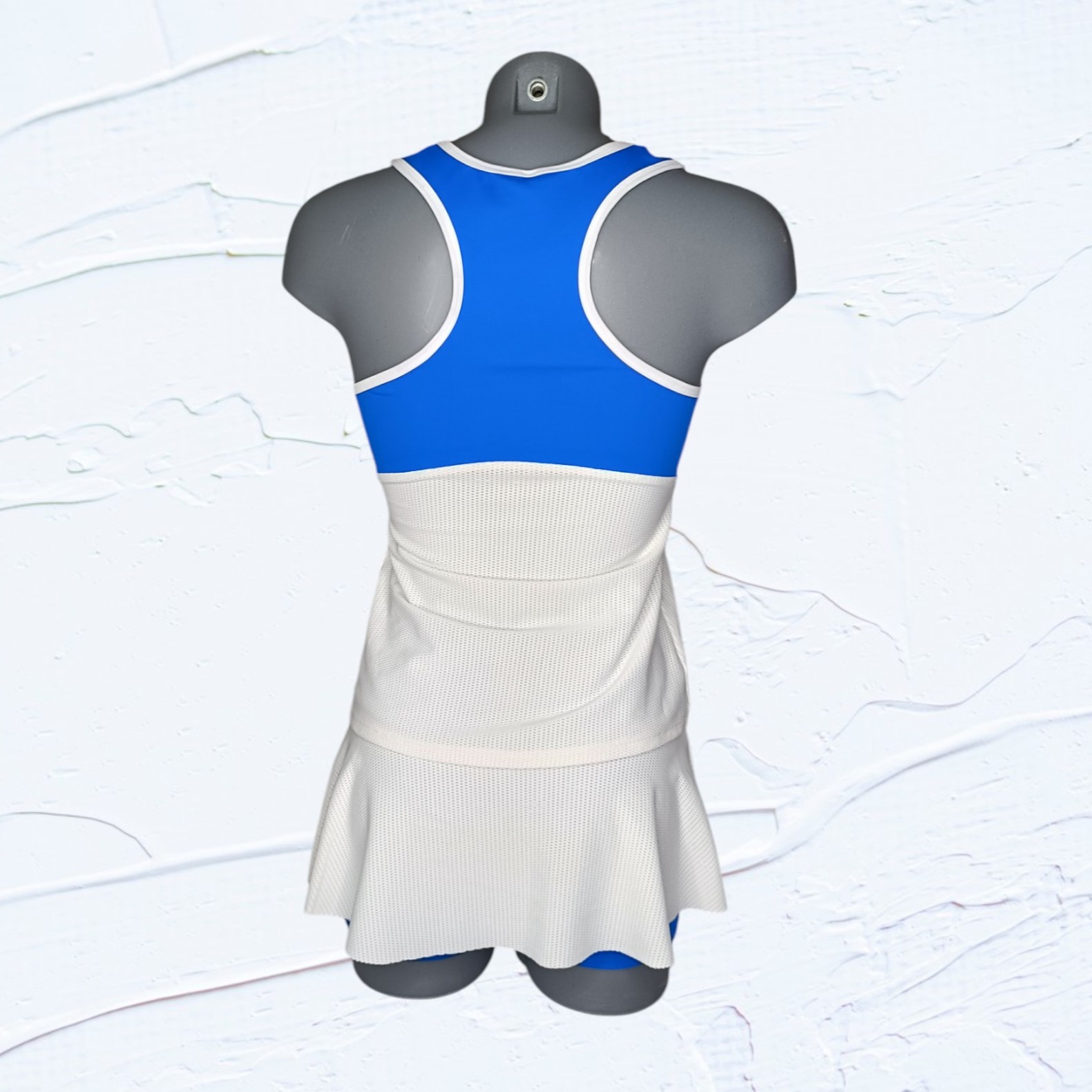 La parte superior combina un tejido técnico ajustado en la zona del busto con una capa ligera y perforada que aporta movimiento y ventilación. La falda, confeccionada en el mismo tejido blanco microperforado, completa el look con un corte fluido que favorece el movimiento en cada punto del partido.