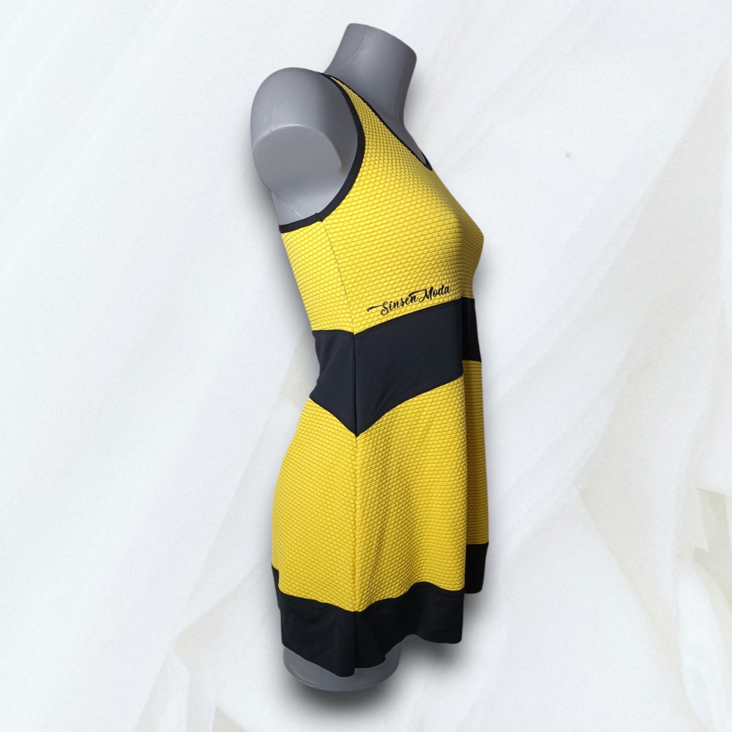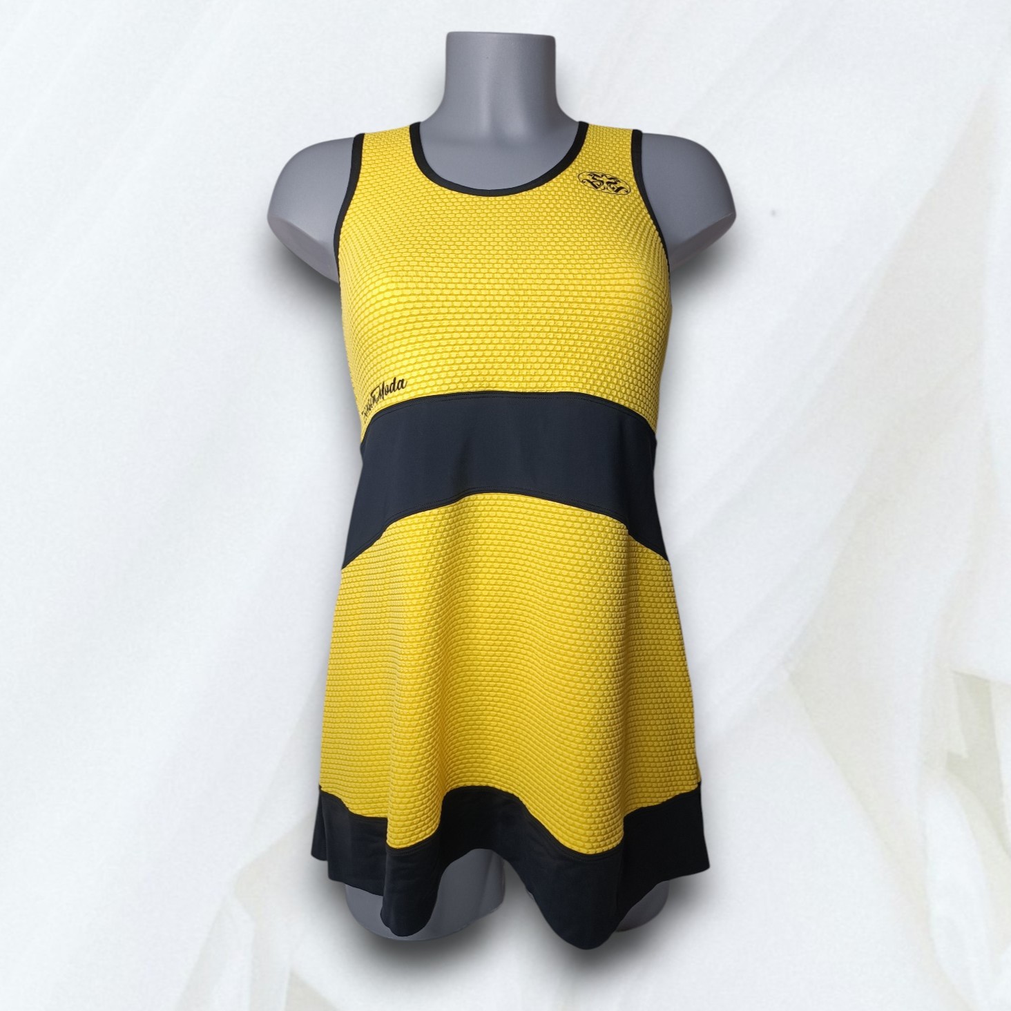 El vestido Erlea de SinSenModa combina diseño deportivo, comodidad y estilo para jugadoras que buscan destacar. Confeccionado en tejido técnico transpirable con textura panal, ofrece frescura y ligereza durante todo el partido. Su diseño bicolor en amarillo y negro estiliza la figura y añade un toque moderno y llamativo.
